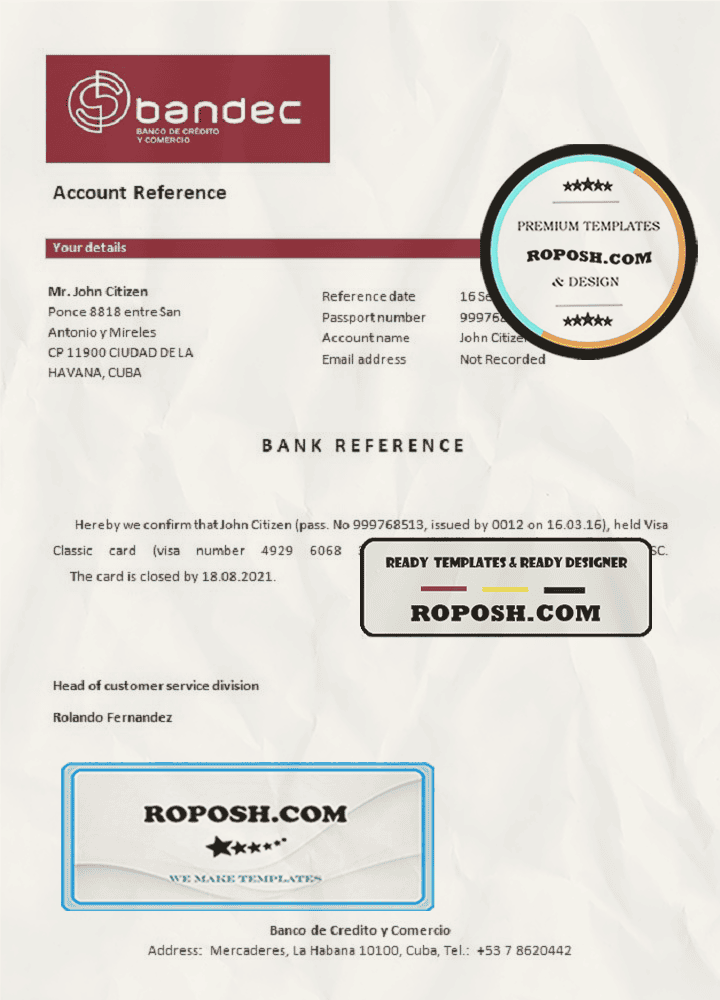 Cuba Bandec Banco de Credito y Comercio bank account closure reference letter template in Word and PDF format