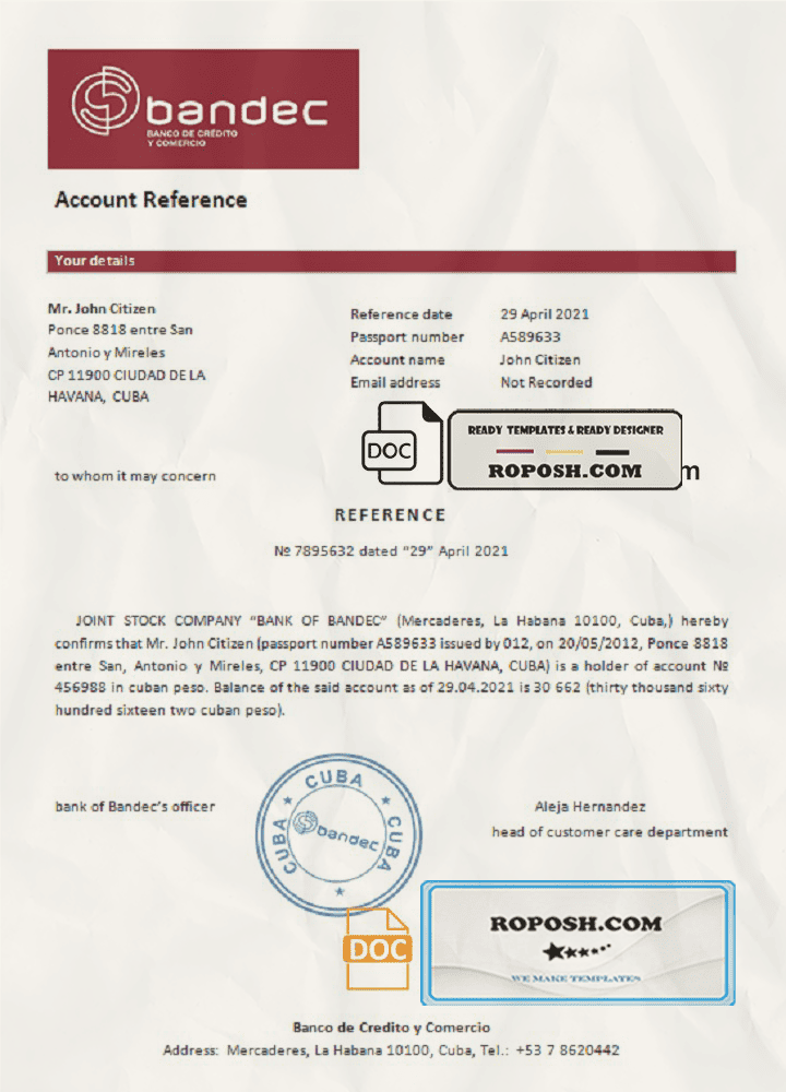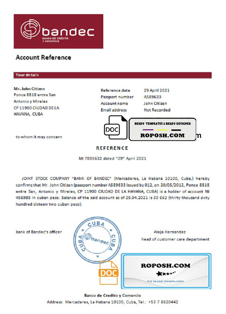 Be the first to review “Cuba Bandec Banco de Credito y Comercio bank account reference letter template in Word and PDF format”
