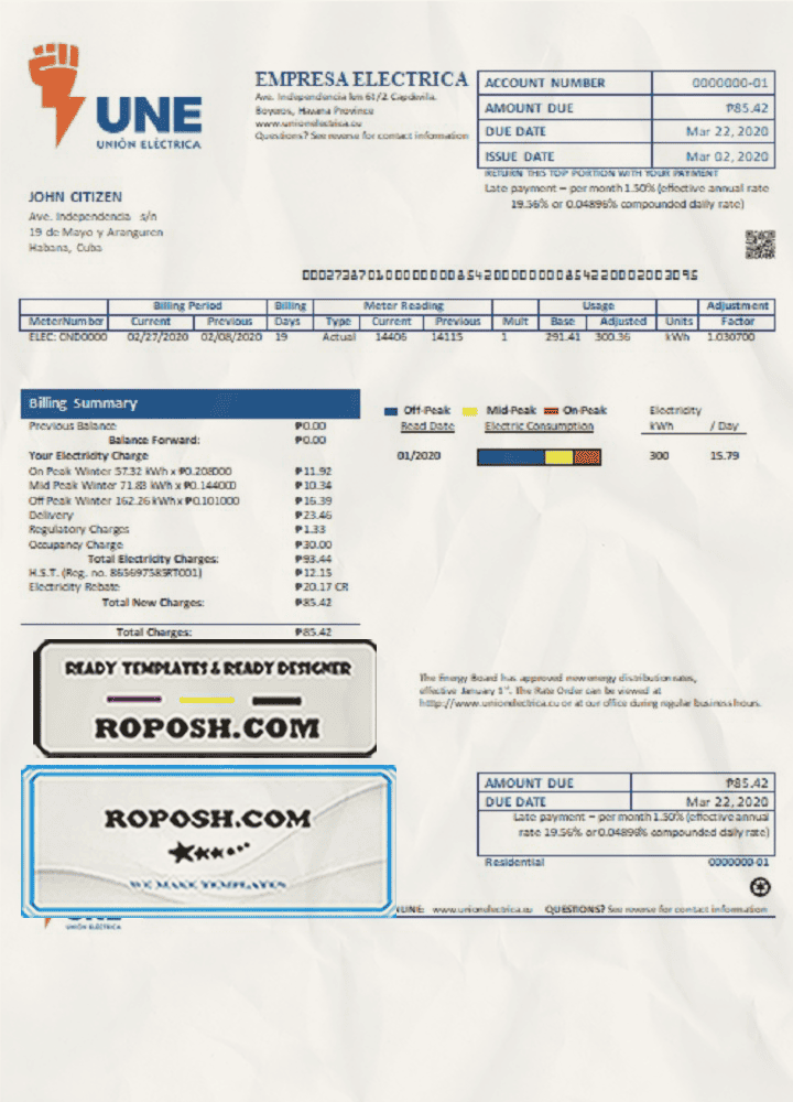 Get your blank Cuba Empresa Electrica utility bill template from Roposh today. Customize it with your own information to create a realistic editable utility bill for proof of address. Ideal for situations where your utility bill is expired, stolen, or unavailable. Explore our wide range of templates, including passport PSD templates, ID card PSD templates, bank statement PSD templates, driver’s license PSD templates, and utility bill PSD templates.