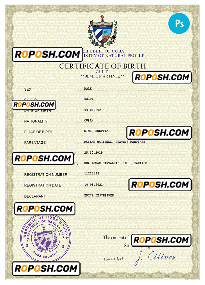 roposh offers hundreds of high-quality, realistic, and customizable birth certificates. The Cuba birth certificate template is fully fillable, and you can complete it with any information you wish, such as name, surname, birth date, place of birth and etc. Whether you are using our PSD template (a layer-based adobe photoshop file) or our PDF template (a Microsoft Office editable file) you will get a package with fonts included instantly. No need to worry even if you can’t generate realistic birth proof yourself, we offer reliable editing service with your desired information for an extra charge. Also, we are always online and here to help you experience a confident purchase. So, reach out!