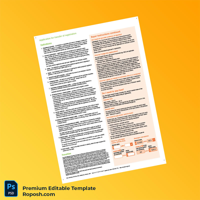 Be the first to review “Customizable Australia VicRoads Vehicle Registration Transfer Application Editable Word & PDF Template 6 page”