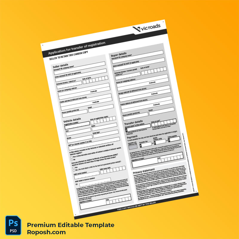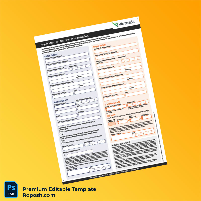 Customizable Australia VicRoads Vehicle Registration Transfer Application Editable Word & PDF Template 6 page