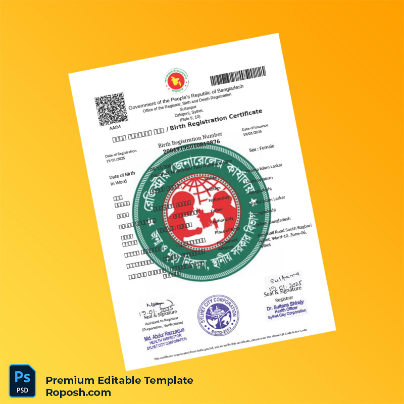 The Bangladesh Office of the Registrar Birth Registration Certificate Word & PDF Template is a fully customizable and editable solution designed for professionals who need to efficiently manage official birth registration documents. Perfect for government offices, legal professionals, and administrative personnel, this template enables users to quickly generate accurate and compliant certificates in both Word and PDF formats.