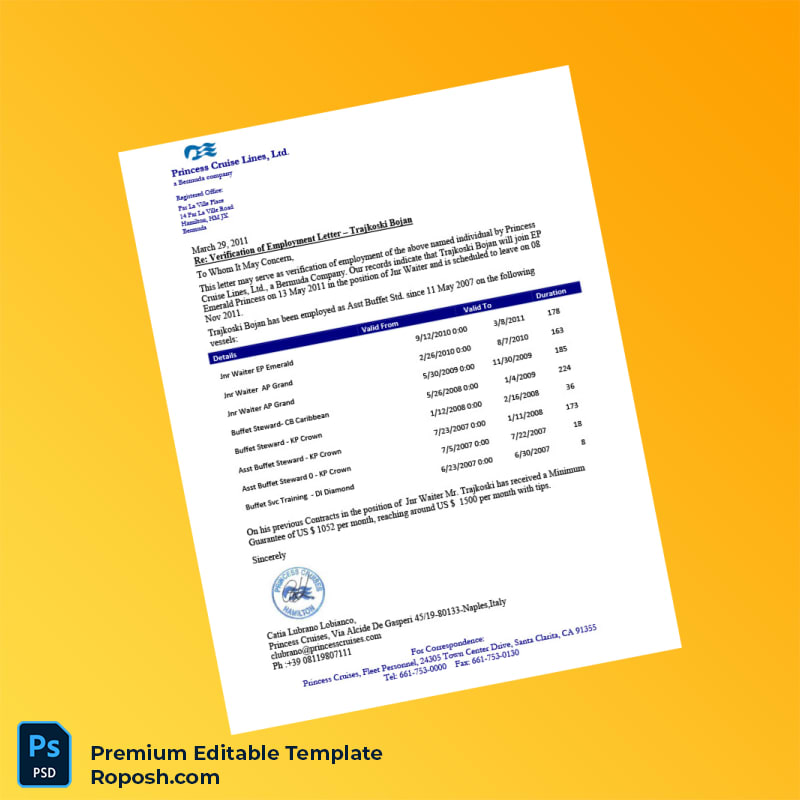 Customizable Bermuda Princess Cruise Lines Employment Verification Letter Word & PDF Template