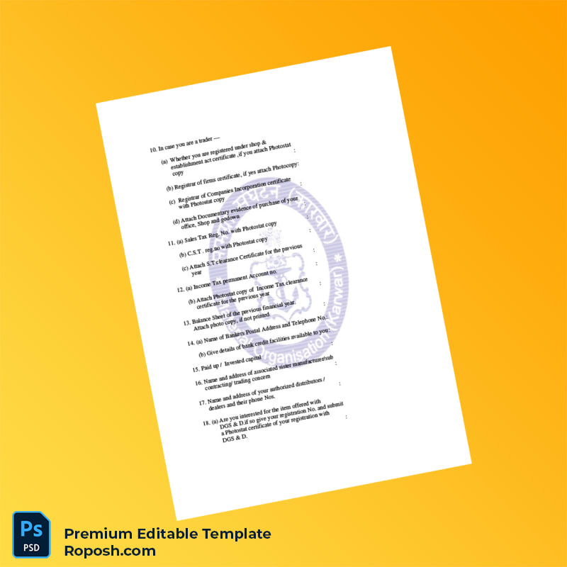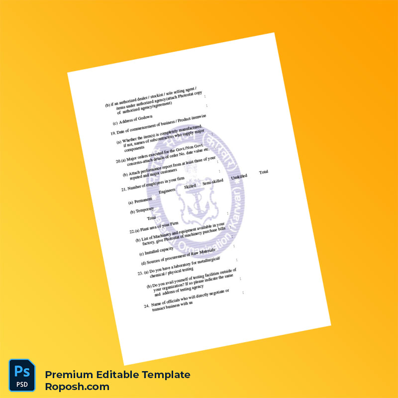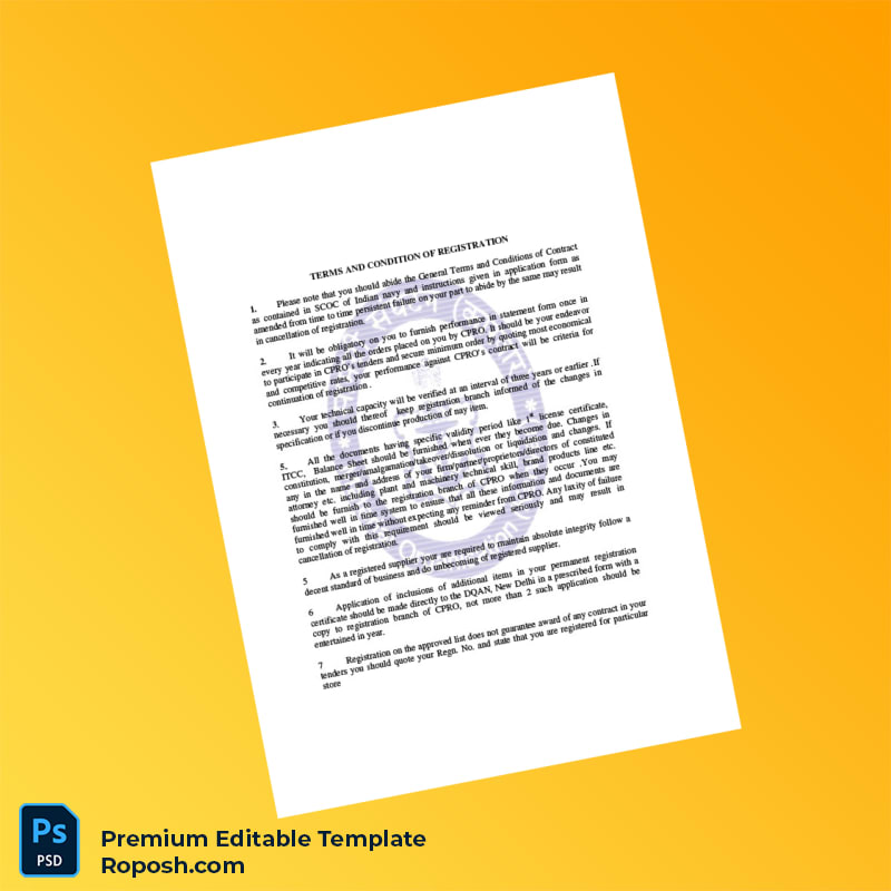 Streamline your vendor registration process with the Country Controller of Procurement Vendor Registration Form Word & PDF Template, designed for professionals seeking an efficient and reliable way to create a comprehensive registration document. This editable registration certificate template enables seamless customization, ensuring all essential details—from company identity to vendor credentials—are clearly and professionally presented.
