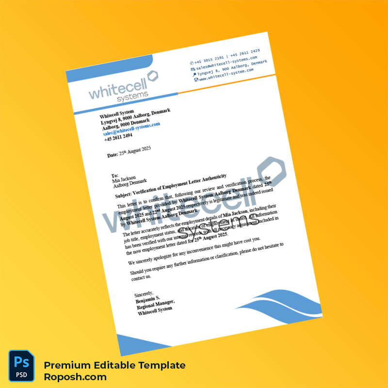 Customizable Denmark Whitecell System Employment Verification Letter Word & PDF Template