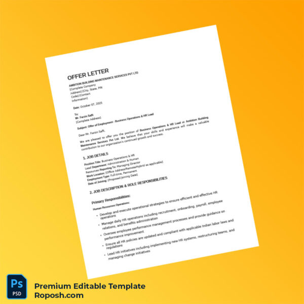 Ensure your employment proof processes are handled smoothly with the India Ambition Building Maintenance Services Pvt Ltd Employment Verification Letter Word & PDF Template. This versatile and fully editable template is designed for professionals needing a formal, compliant, and easy-to-customize certificate of employment. Whether you’re an HR specialist, an employee needing a job confirmation letter, or a consultant preparing official documents, this template offers an efficient solution.