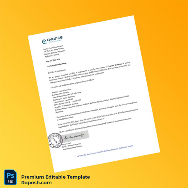 Enhance your administrative efficiency and ensure professionalism with this customizable India Avance Consulting Services employment verification letter template. Simplify your verification tasks, maintain compliance standards, and impress stakeholders with clear, accurate documentation. Purchase now to download and start customizing your employment verification letters with confidence.