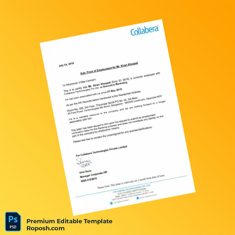 Customizable India Collabera Technologies Private Limited Proof of Employment Letter Word & PDF Template