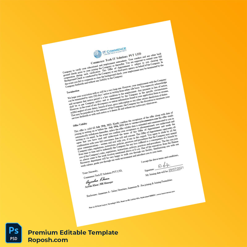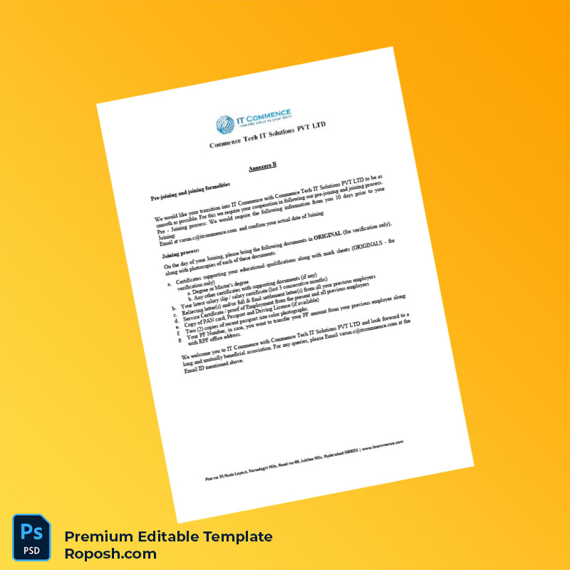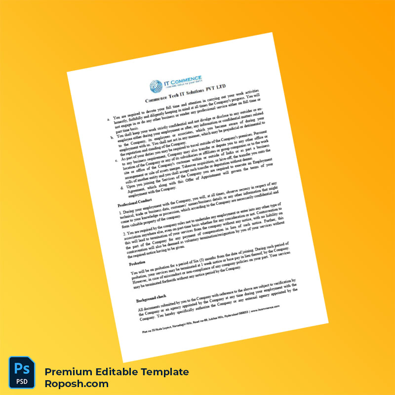 Customizable India Commence Tech IT Solutions PVT LTD Offer Letter Word & PDF Template 5 page