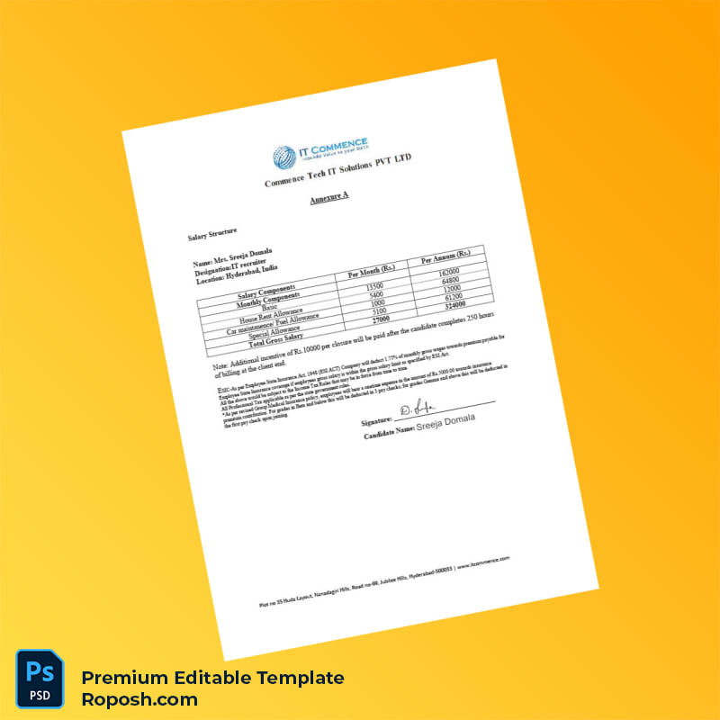 Empower your professional documentation process with the India Commence Tech IT Solutions PVT LTD Offer Letter Word & PDF Template, a fully editable and customizable solution designed to meet the highest standards of employment verification. This template is crafted specifically for HR professionals, recruiters, and administrative staff who require a flawless and rapid method to generate proof of employment documents.