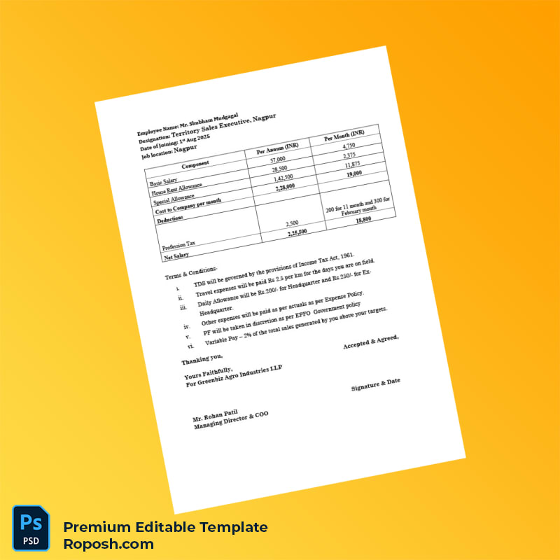 Customizable India Greenbiz Agro Industries LLP Offer Letter Word & PDF Template. Fully editable and easy to modify for professional employment documents.