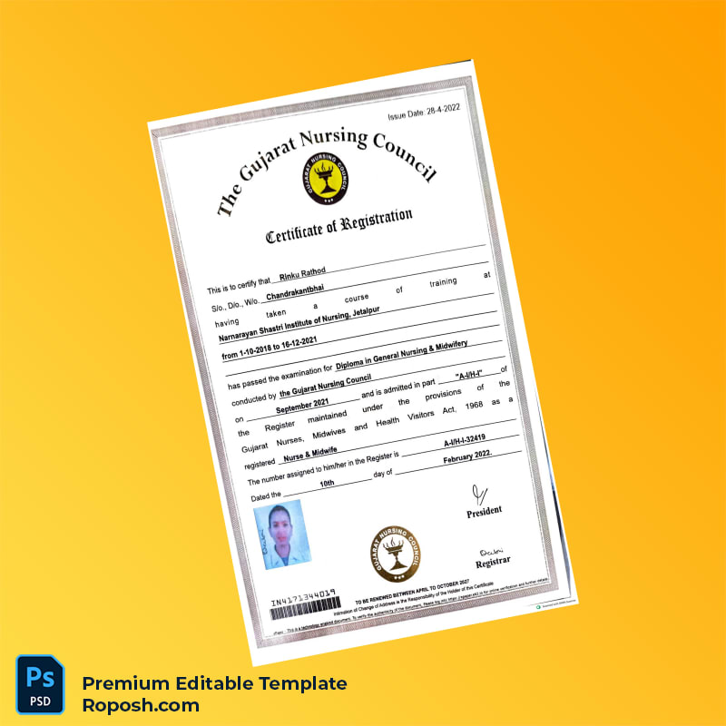 Customizable India Gujarat Nursing Council Registration Certificate Word & PDF Template