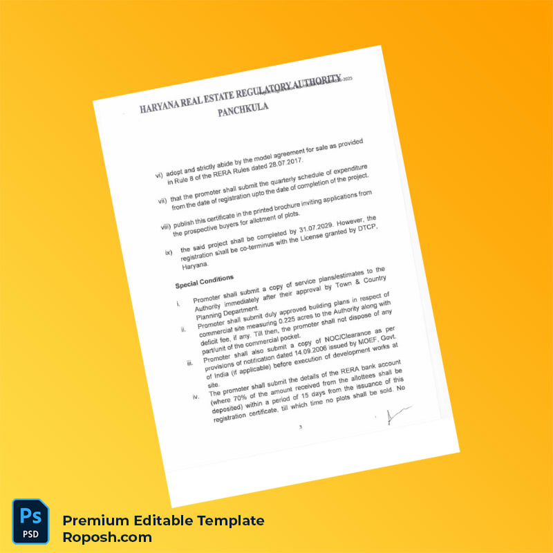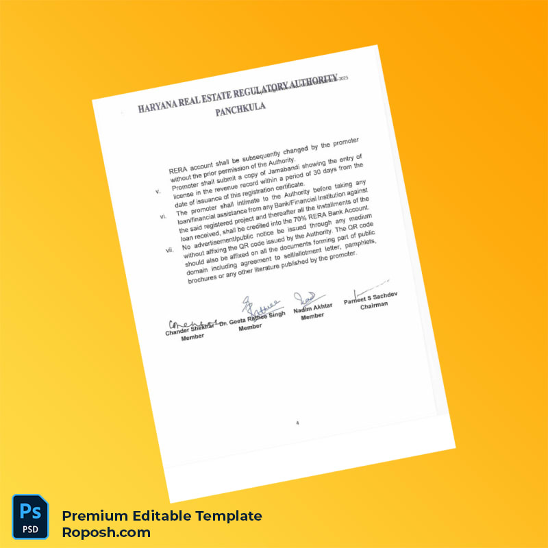 Customizable India Haryana Real Estate Regulatory Authority Registration Certificate Editable Word & PDF Template 4 page