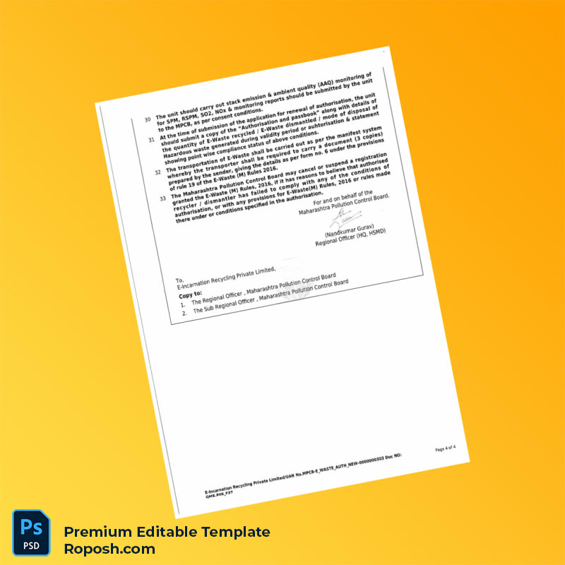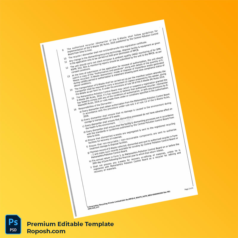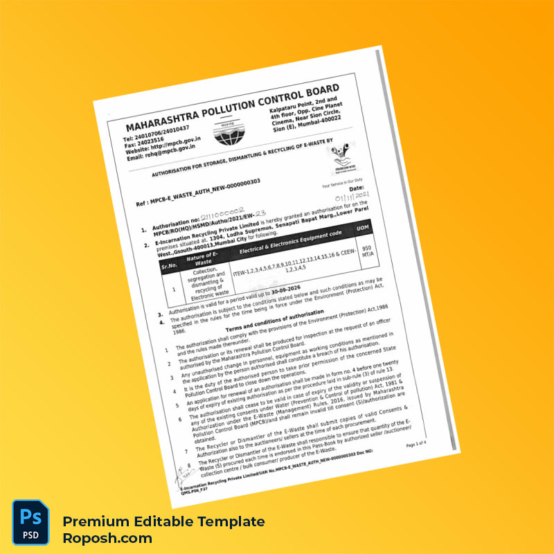 Efficiently managing your environmental compliance documentation just got easier with our India Maharashtra Pollution Control Board Registration Certificate Word & PDF Template. This editable registration certificate template is professionally designed to help businesses quickly replace or create their essential registration documents without hassle.