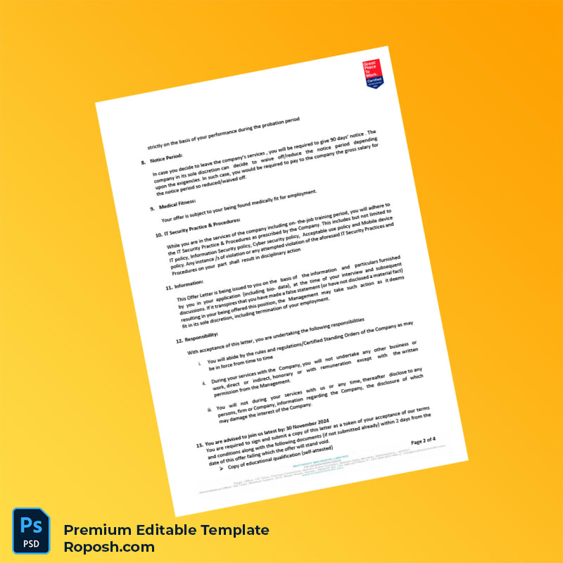 This ready-to-use template allows you to easily edit all document details including employee name, position, employment dates, and company information using Microsoft Word or any compatible PDF editor. High-resolution formatting ensures that your employment verification letter looks crisp and professional whether it’s shared digitally or printed. Designed with all official formatting standards in mind, this certificate of employment template includes necessary fonts and layout styles for an authentic presentation.