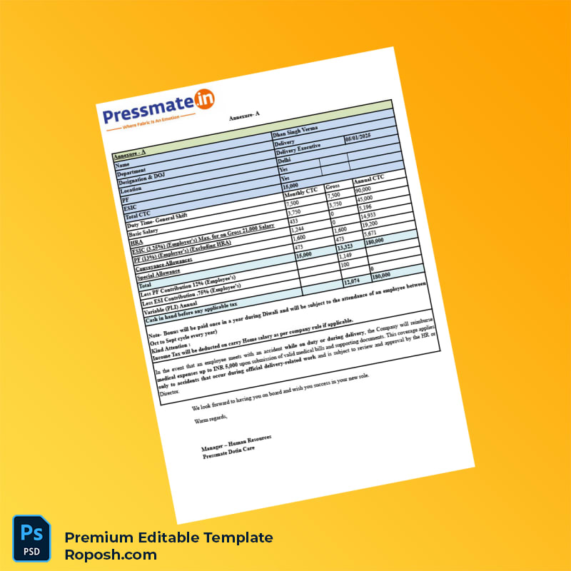 The India Pressmate Employment Verification Letter Word & PDF Template offers a straightforward solution for professionals needing a reliable and editable proof of employment document. Designed with precision and usability in mind, this template helps you generate accurate job confirmation and employment verification letters swiftly, alleviating the stress of document preparation and ensuring compliance with formal standards.