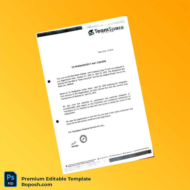 Customizable India TeamSpace Employment Verification Letter Word & PDF Template 4 page