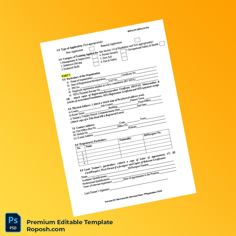 Customizable Kenya NITA Application Form for Registration and Renewal in Word & PDF. Editable template for quick, professional certificate updates.