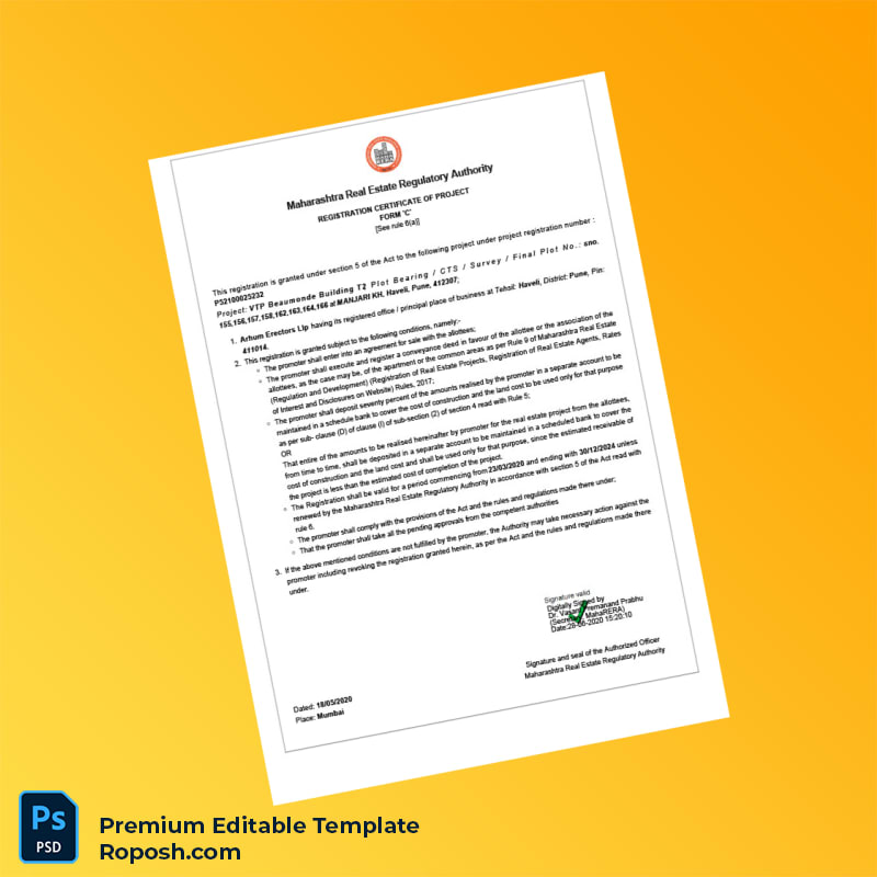 Customizable Maharashtra Real Estate Regulatory Authority Registration Certificate of Project Form C Editable Word & PDF Template