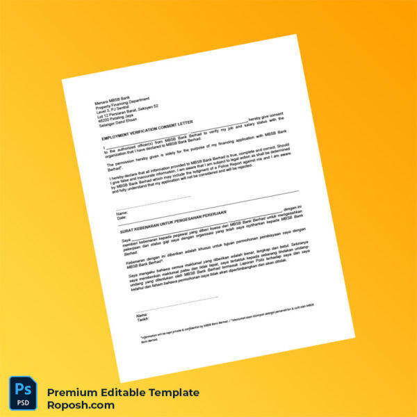 Forget the hassle of drafting employment verification letters from scratch. Use this Malaysia MSBSB Bank Employment Verification Letter Word & PDF Template now to provide consistent, accurate employment verification quickly and confidently. Download your customizable template instantly and tailor it to match your exact information requirements with ease.