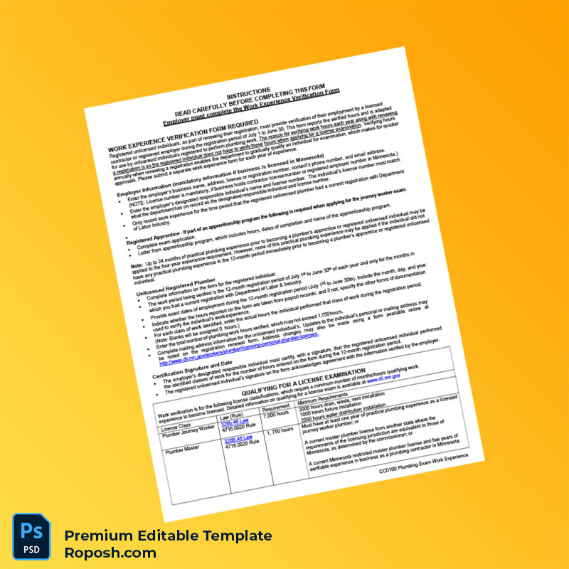 Customizable Minnesota Plumbing Work Experience Verification Form Word & PDF Template 2 page