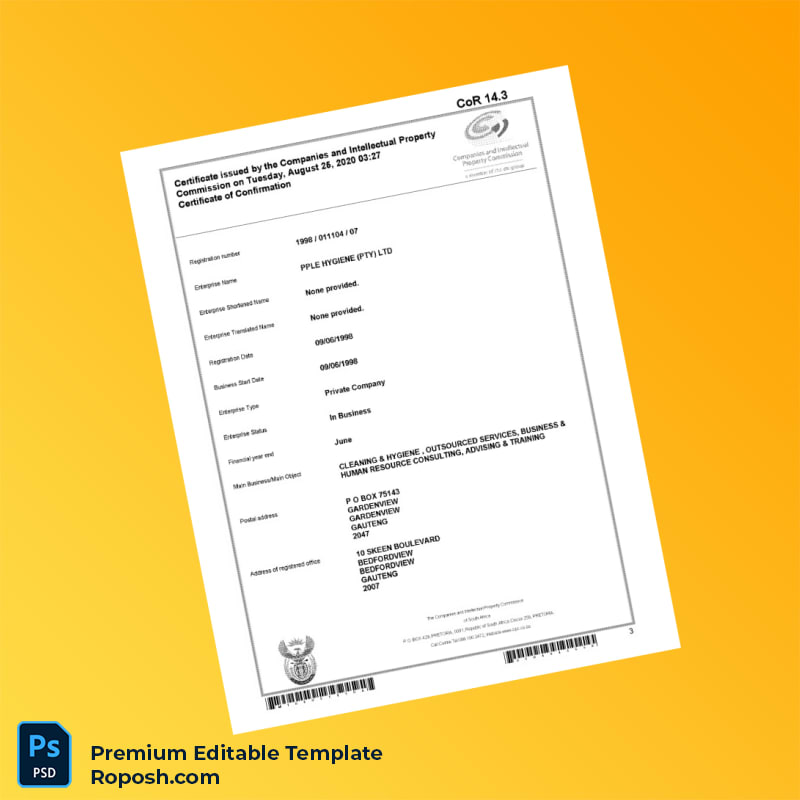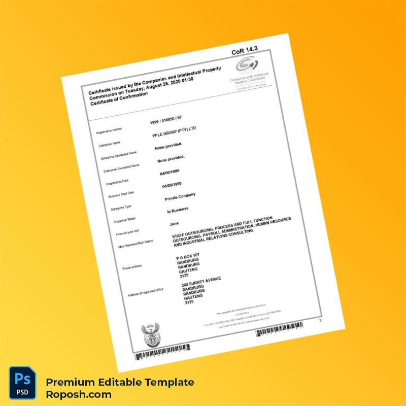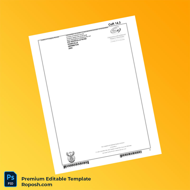 Customizable South Africa CIPC Registration Certificate Word & PDF Template. Fully editable and easy to modify to fit your business details.