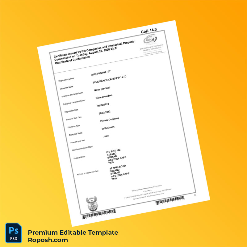 Customizable South Africa CIPC Registration Certificate Editable Word & PDF Template 7 page