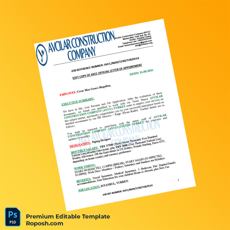 Discover the Turkey Avcilar Construction Company Employment Verification Letter Word & PDF Template, a fully editable and professionally designed document crafted to simplify your job confirmation needs. This template addresses the common professional challenge of swiftly providing accurate employment proof, ensuring your requests are handled efficiently, whether for visa applications, loan processing, or employment transitions.