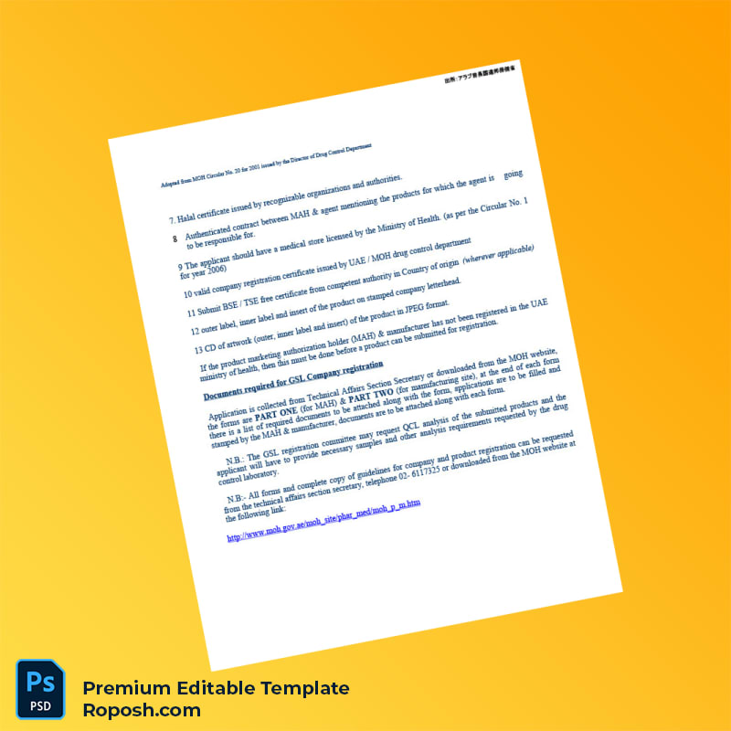 Optimize your document management and ensure seamless compliance with the Customizable UAE Ministry of Health GSL Product Registration Requirements Word & PDF Template. Download now and experience a significant improvement in how you manage your company’s registration certificates.