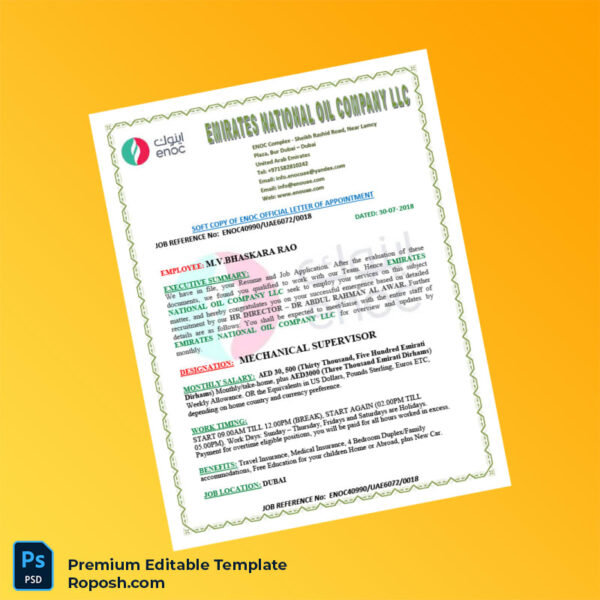 In the professional world, having a clear and credible proof of employment is essential. Our United Arab Emirates Emirates National Oil Company LLC Employment Verification Letter Word & PDF Template offers a seamless solution to this need, empowering professionals across the UAE with an editable and professionally designed document that validates their job status efficiently.