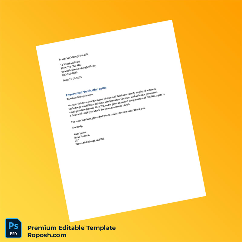 Customizable United Kingdom Braun McCullough and Hill Employment Verification Letter Word & PDF Template