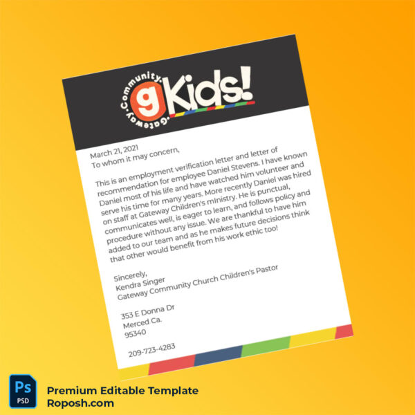 Don’t let missing or outdated employment documents hinder your professional or personal plans. Use this customizable, easy-to-edit United States Gateway Community Church Employment Verification Letter Word & PDF Template to promptly generate your official verification letter. Get started now and ensure your employment status is documented clearly and professionally.