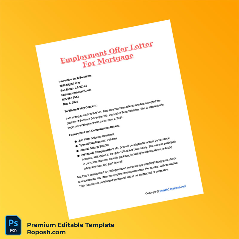 Experience the ease of creating a formal employment verification letter with our fully editable and customizable United States Innovative Tech Solutions Employment Offer Letter Word & PDF Template. Designed for HR professionals, recruiters, and business managers worldwide, this template offers a seamless way to present job confirmation and employment details with precision and professionalism.