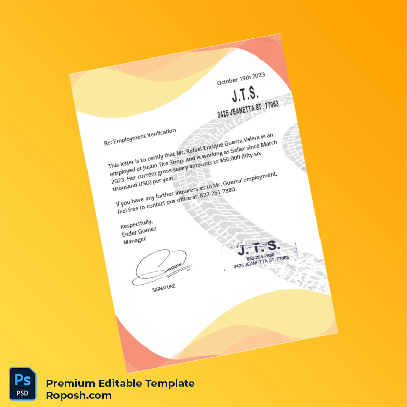 Customizable United States Justin Tire Shop Employment Verification Letter Word & PDF Template
