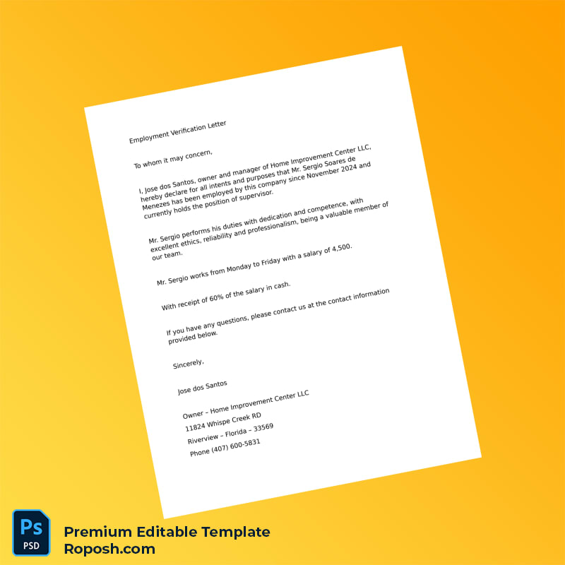Empower your human resources or administrative team by choosing our USA Home Improvement Center LLC Employment Verification Letter template. Click to download your editable Word and PDF files now and take control of your employment verification process with confidence and ease.