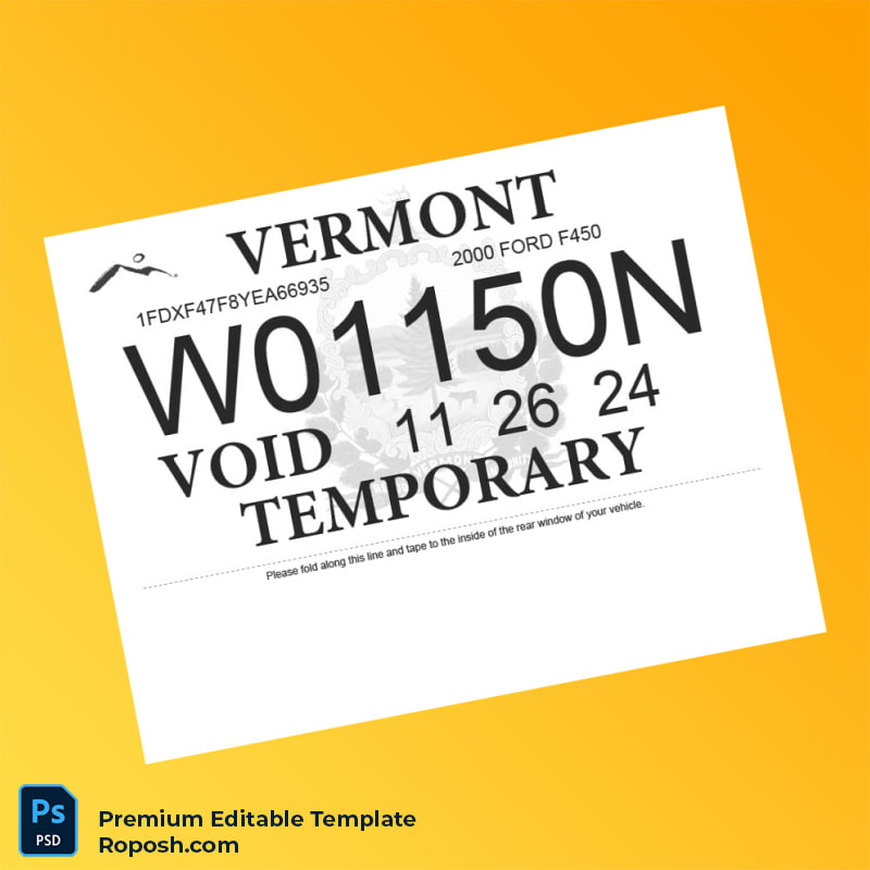 Customizable Vermont Department of Motor Vehicles Temporary Registration Certificate Template