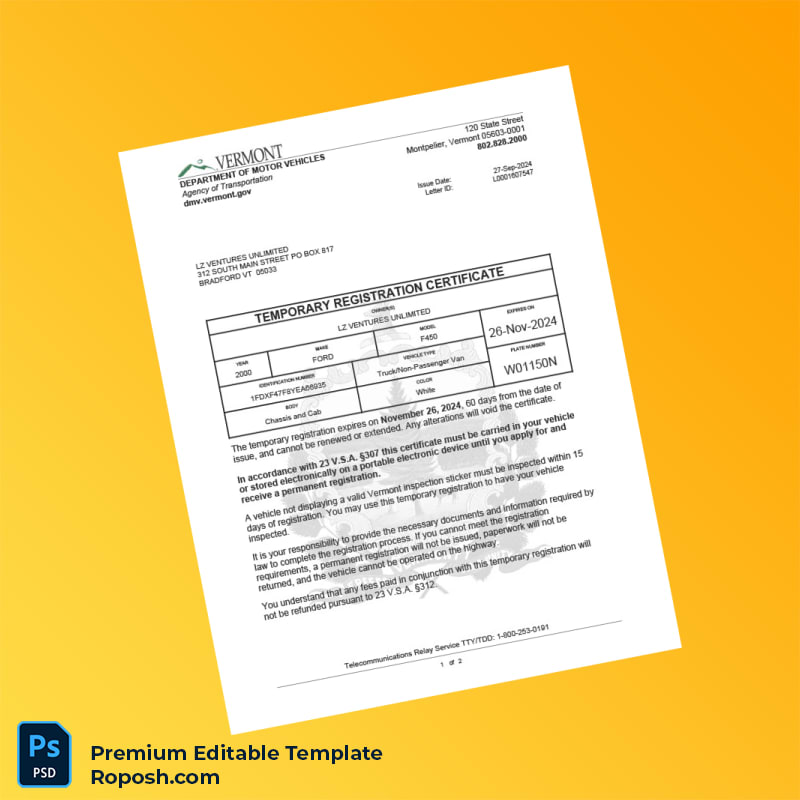 Customizable Vermont Department of Motor Vehicles Temporary Registration Certificate Editable Word & PDF Template 2 page