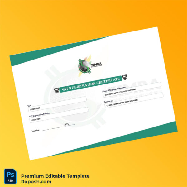 Take action now and equip your business with this premium Zimbabwe Zimbabwe Revenue Authority VAT Registration Certificate Word & PDF Template. Simplify your registration document management process, minimize downtime caused by lost or expired certificates, and ensure your records remain accurate and up to date.