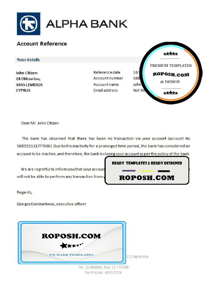 Cyprus Alpha Bank account closure reference letter template in Word and PDF format