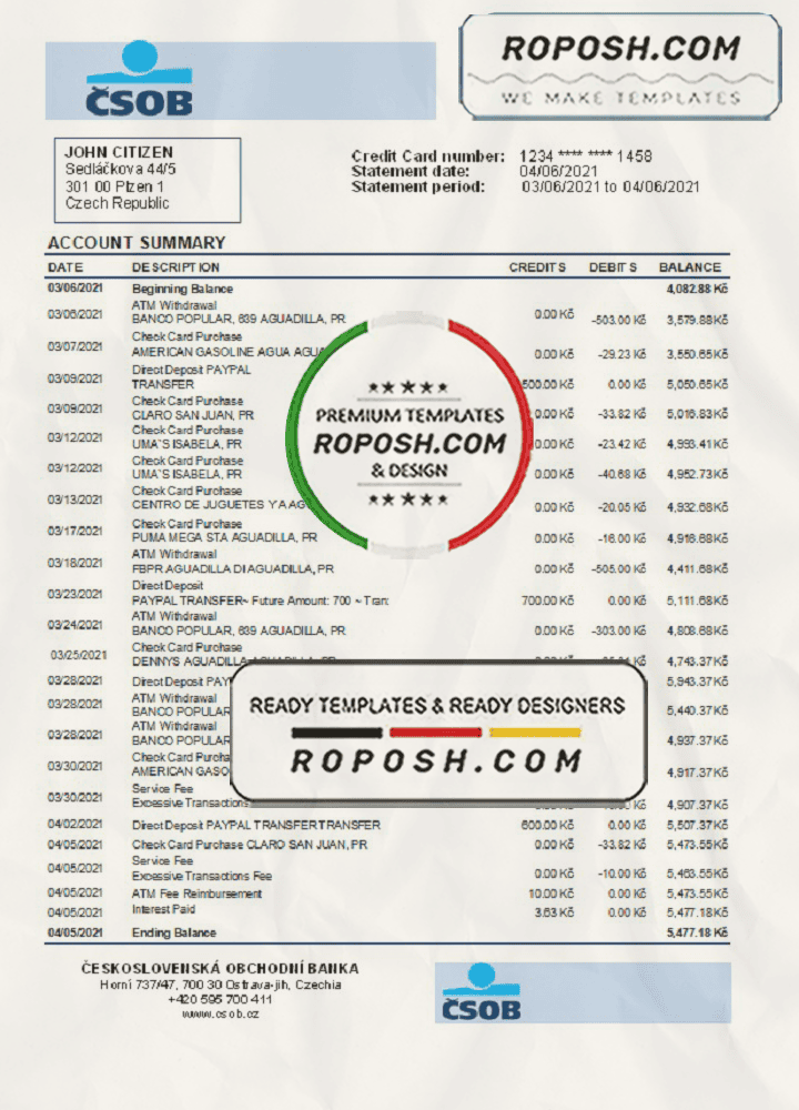 Get your fully editable Czech Republic Československá Obchodní Banka bank statement template from Roposh today. Customize it with your own information to create a realistic bank statement. This is especially useful if your bank statement is expired, stolen, or unavailable. We also offer editable credit card templates, ID card templates, bank statement PSD templates, driver’s license PSD templates, and printable editable blank utility bill templates.