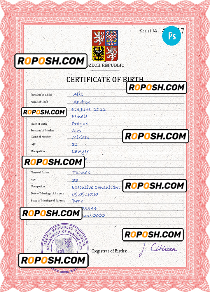 roposh offers hundreds of high-quality, realistic, and customizable birth certificates. The Czechia birth certificate template is fully fillable, and you can complete it with any information you wish, such as name, surname, birth date, place of birth and etc. Whether you are using our PSD template (a layer-based adobe photoshop file) or our PDF template (a Microsoft Office editable file) you will get a package with fonts included instantly. No need to worry even if you can’t generate realistic birth proof yourself, we offer reliable editing service with your desired information for an extra charge. Also, we are always online and here to help you experience a confident purchase. So, reach out!