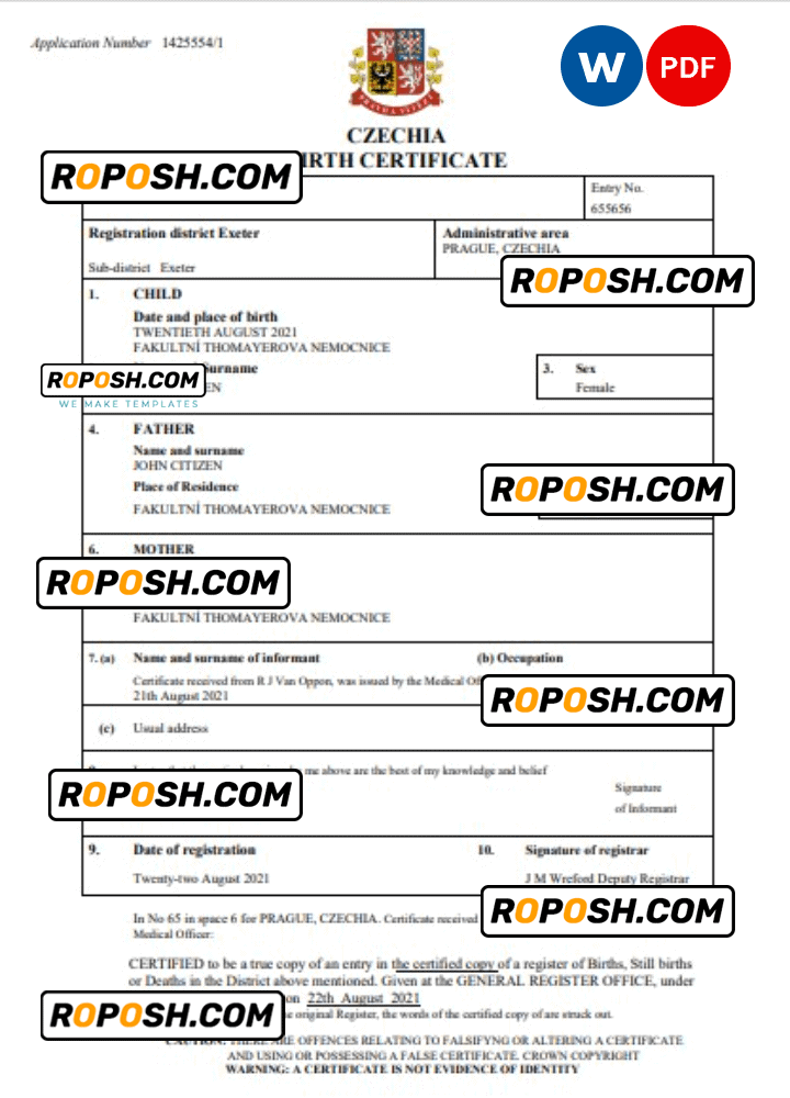 roposh offers hundreds of high-quality, realistic, and customizable birth certificates. The Czechia birth certificate template is fully fillable, and you can complete it with any information you wish, such as name, surname, birth date, place of birth and etc. Whether you are using our PSD template (a layer-based adobe photoshop file) or our PDF template (a Microsoft Office editable file) you will get a package with fonts included instantly. No need to worry even if you can’t generate realistic birth proof yourself, we offer reliable editing service with your desired information for an extra charge. Also, we are always online and here to help you experience a confident purchase. So, reach out!