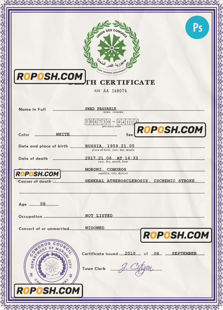 Comoros death certificate PSD template, completely editable