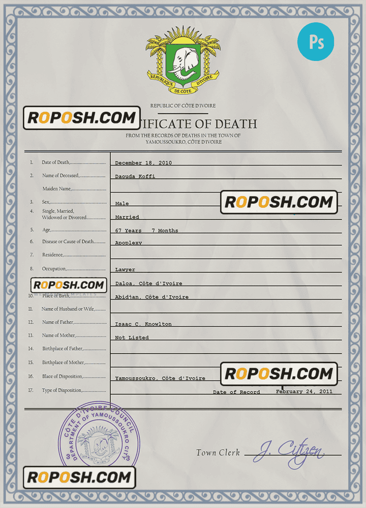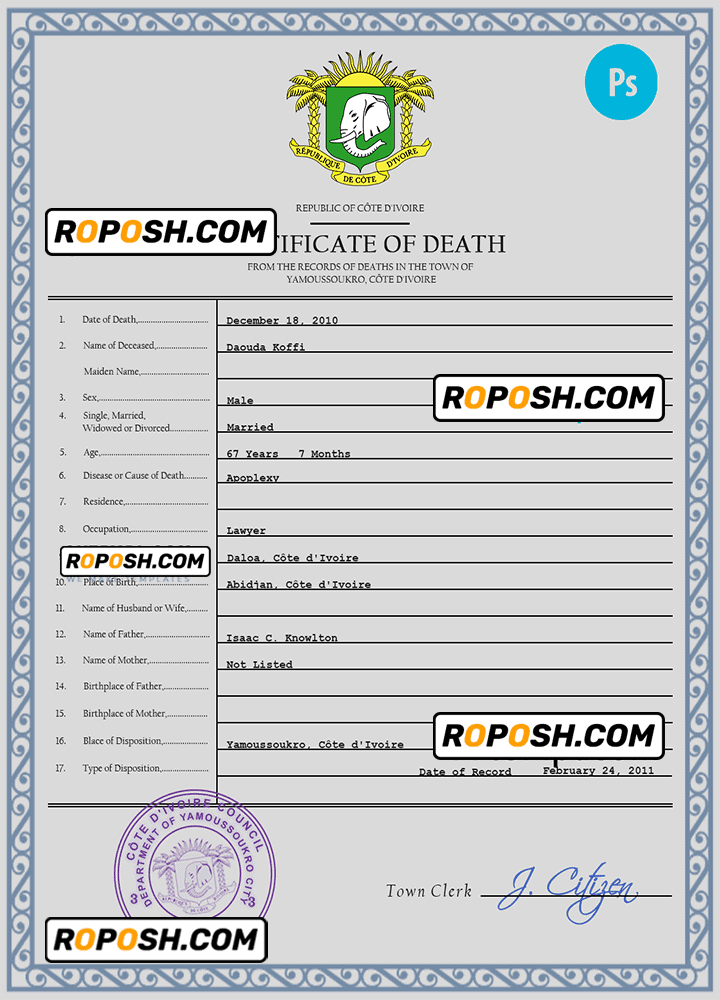 Explore a vast collection of legitimate-looking editable death certificates for several countries worldwide. The editable Côte d’Ivoire death certificates offers easy access to obtaining the required document for a variety of purposes, predominantly claiming life insurance, pensions, and resolving estates.
