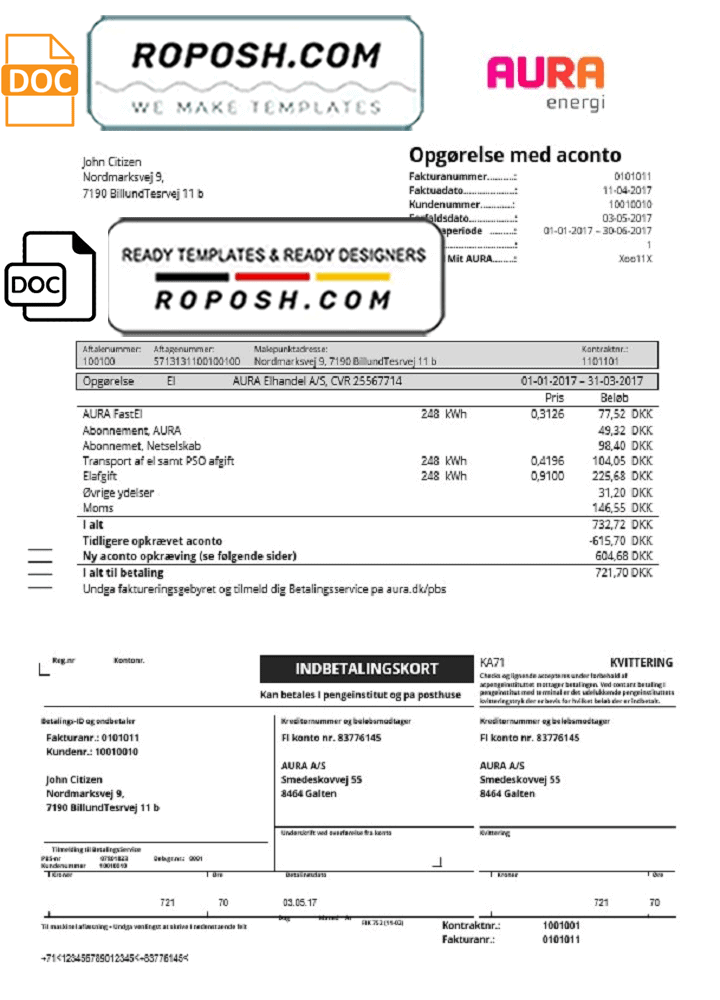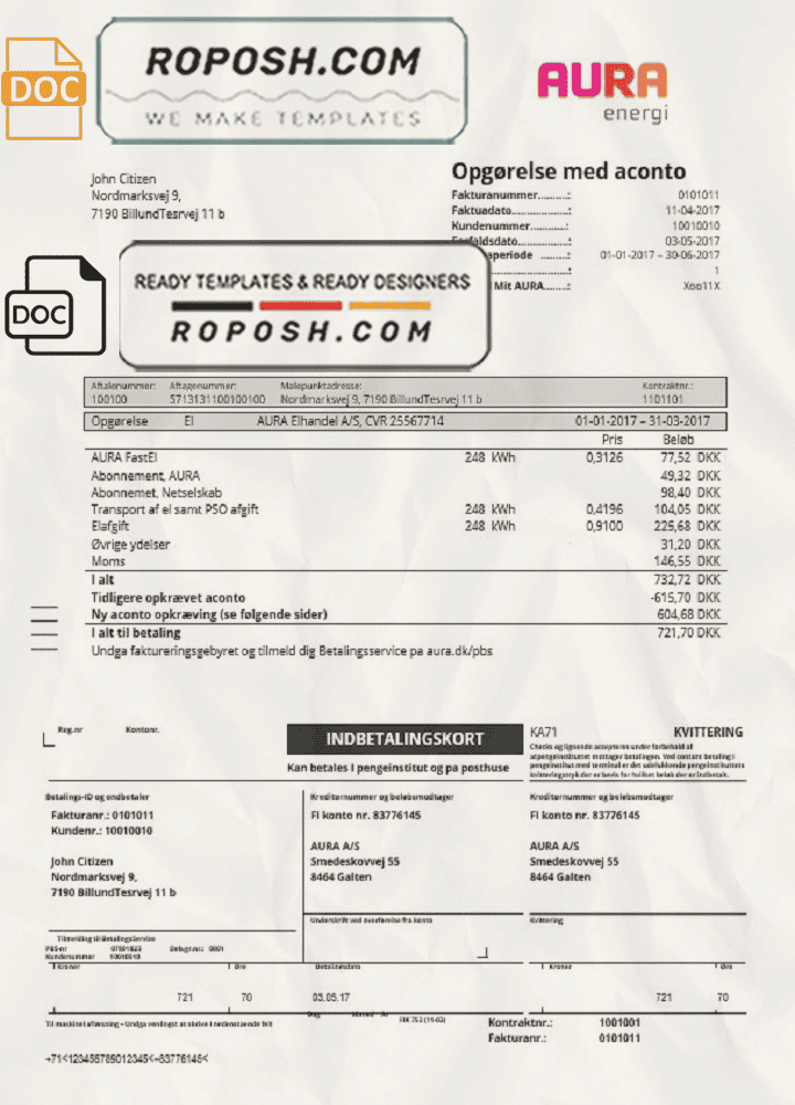 Get your hands on a blank Denmark AURA Energi utility bill template from our website, Roposh. Customize it with your own information to create a editable utility bill for proof of address. Ideal for situations where your utility bill is expired, stolen, or unavailable. We also offer a variety of other templates, including passport PSD templates, ID card PSD templates, bank statement PSD templates, driver’s license PSD templates, and more.