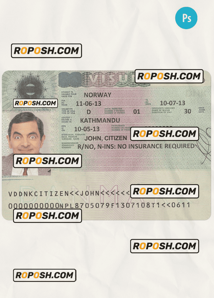 DENMARK entrance visa template psd. Buy Customizable Travel Visa Template with high quality and enjoy its unique features such as easy to customize, Layer based, fonts included sample. you can edit this template and  put any name, address, license number, Id number, birth date, height, weight, expire date, change photos etc. This Photoshop template is a layer based psd file and it’s easy to Editing.To modify this photoshop template file you will need a Photo editing software such as Adobe Photoshop No need to be expert on editing software like adobe Photoshop. However, You just have to basic knowledge on adobe photoshop, to edit this template. Never used low quality template. Your account may be suspended. Also, if you’re looking for an editable SSN template, Roposh is by your side so you can get it easily and even for free.