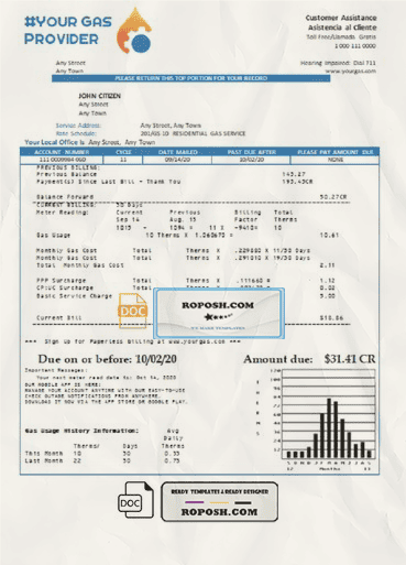 Download our fully editable digital gas multipurpose universal utility bill template in Word format. This high-quality, customizable template is layer-based and includes all necessary fonts. Easily edit the template to include any name, address, license number, ID number, birth date, height, weight, expiration date, and more. Perfect for creating a editable utility bill for proof of address. Ensure your documents are up-to-date and avoid account suspensions with our premium template.