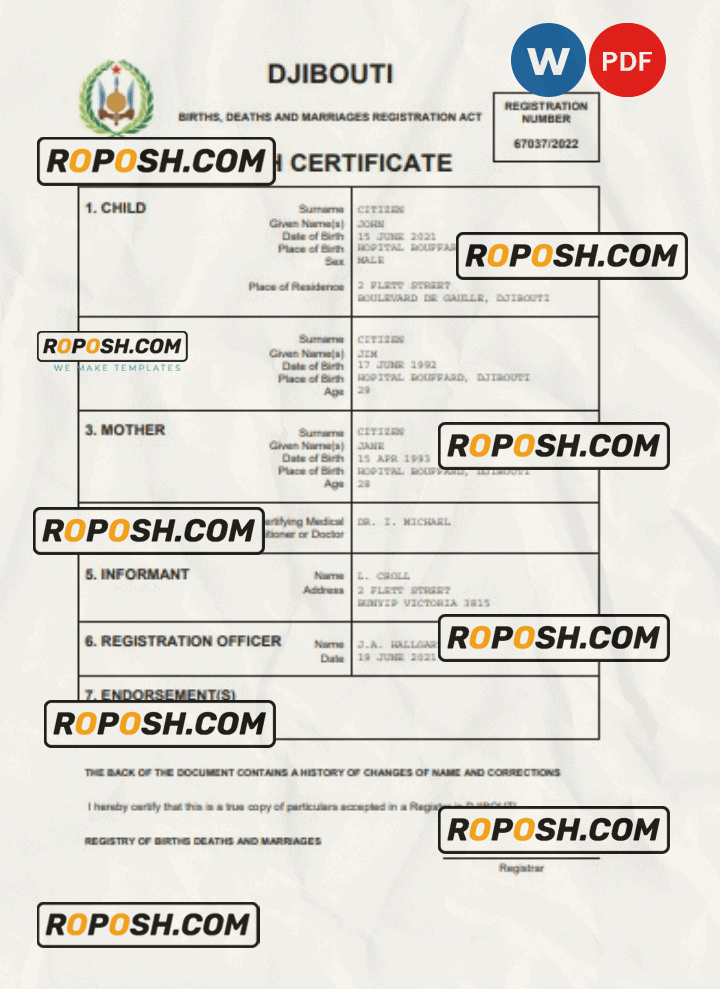 roposh offers hundreds of high-quality, realistic, and customizable birth certificates. The Djibouti birth certificate template is fully fillable, and you can complete it with any information you wish, such as name, surname, birth date, place of birth and etc. Whether you are using our PSD template (a layer-based adobe photoshop file) or our PDF template (a Microsoft Office editable file) you will get a package with fonts included instantly. No need to worry even if you can’t generate realistic birth proof yourself, we offer reliable editing service with your desired information for an extra charge. Also, we are always online and here to help you experience a confident purchase. So, reach out!