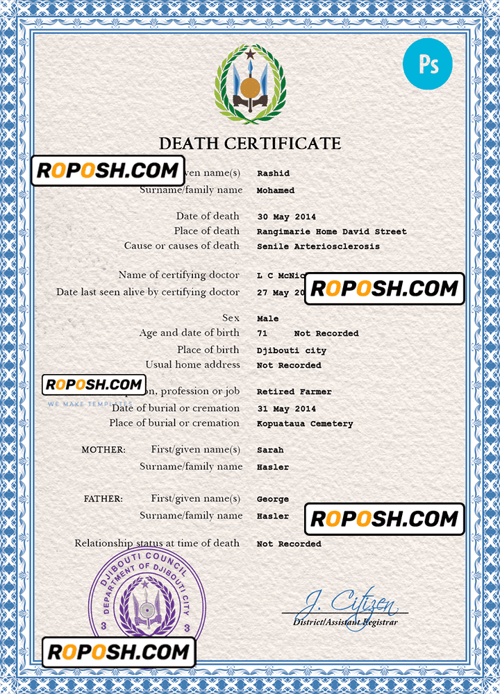 Explore a vast collection of legitimate-looking editable death certificates for several countries worldwide. The editable Djibouti death certificates offers easy access to obtaining the required document for a variety of purposes, predominantly claiming life insurance, pensions, and resolving estates.